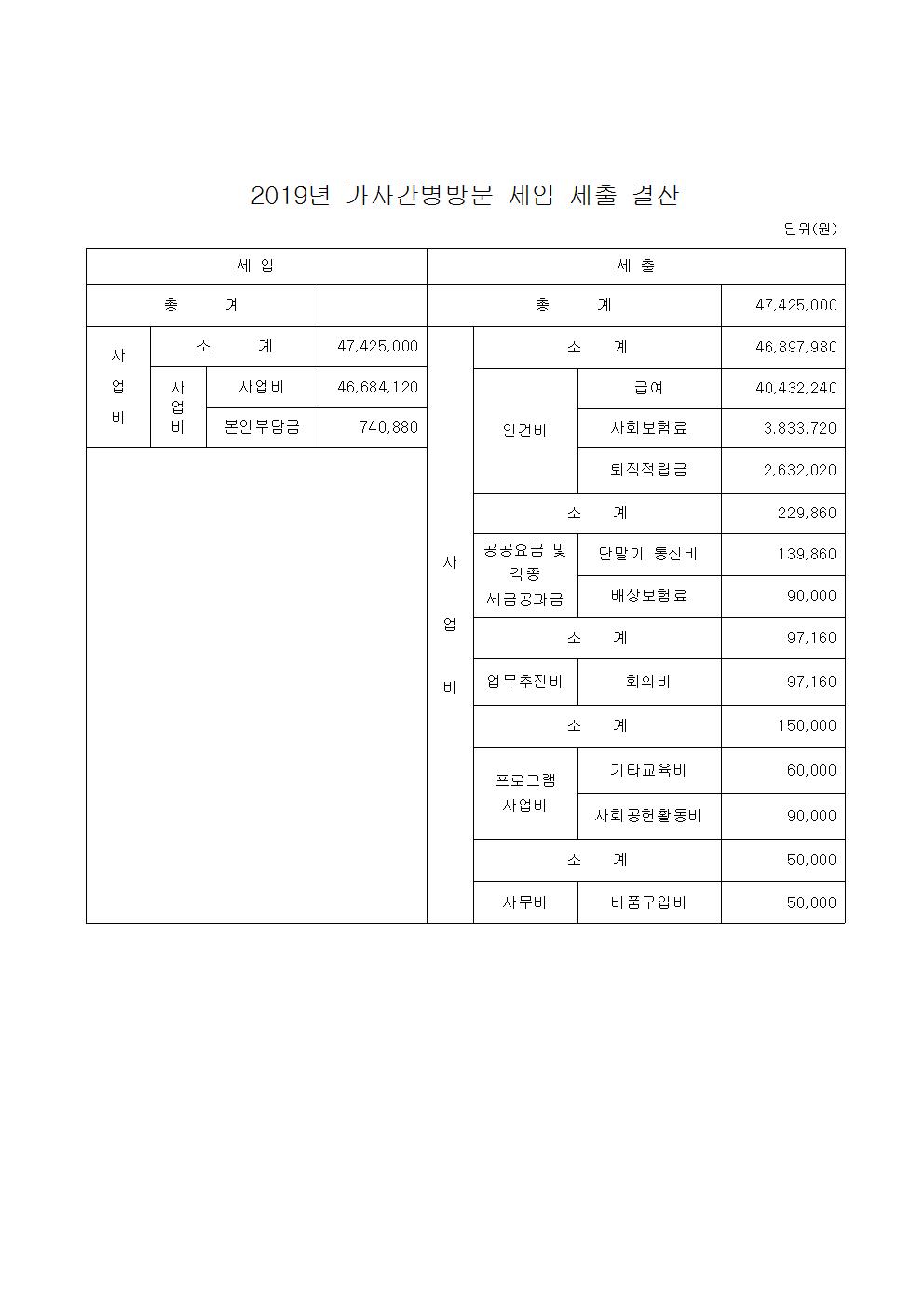 2019년 가사간병 세입세출 결산서