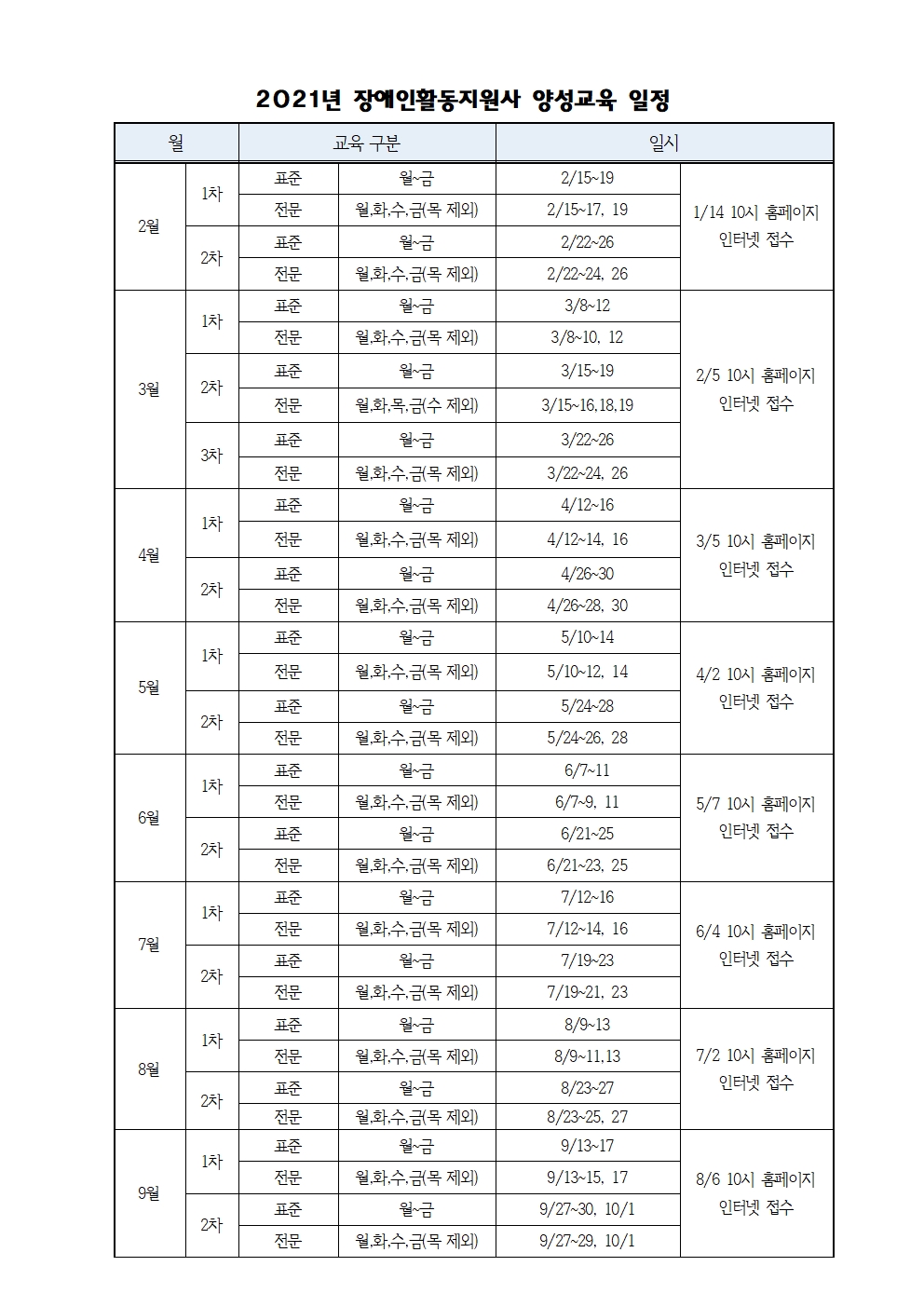 공지사항 2021년 장애인활동지원사 양성교육 일정 안내 작성자 행복더하기 등록일 21.02.19 조회수 9,015 첨부파일 2021년 장애인활동지원사 양성교육 일정.hwp12KB 이전글 다음글 목록