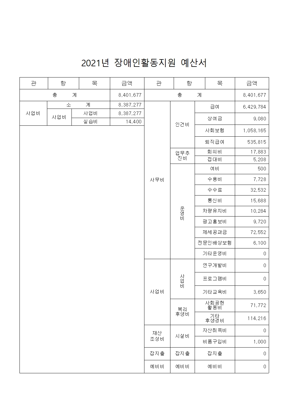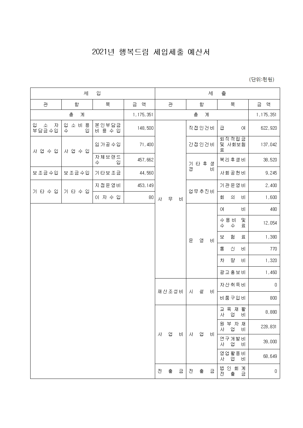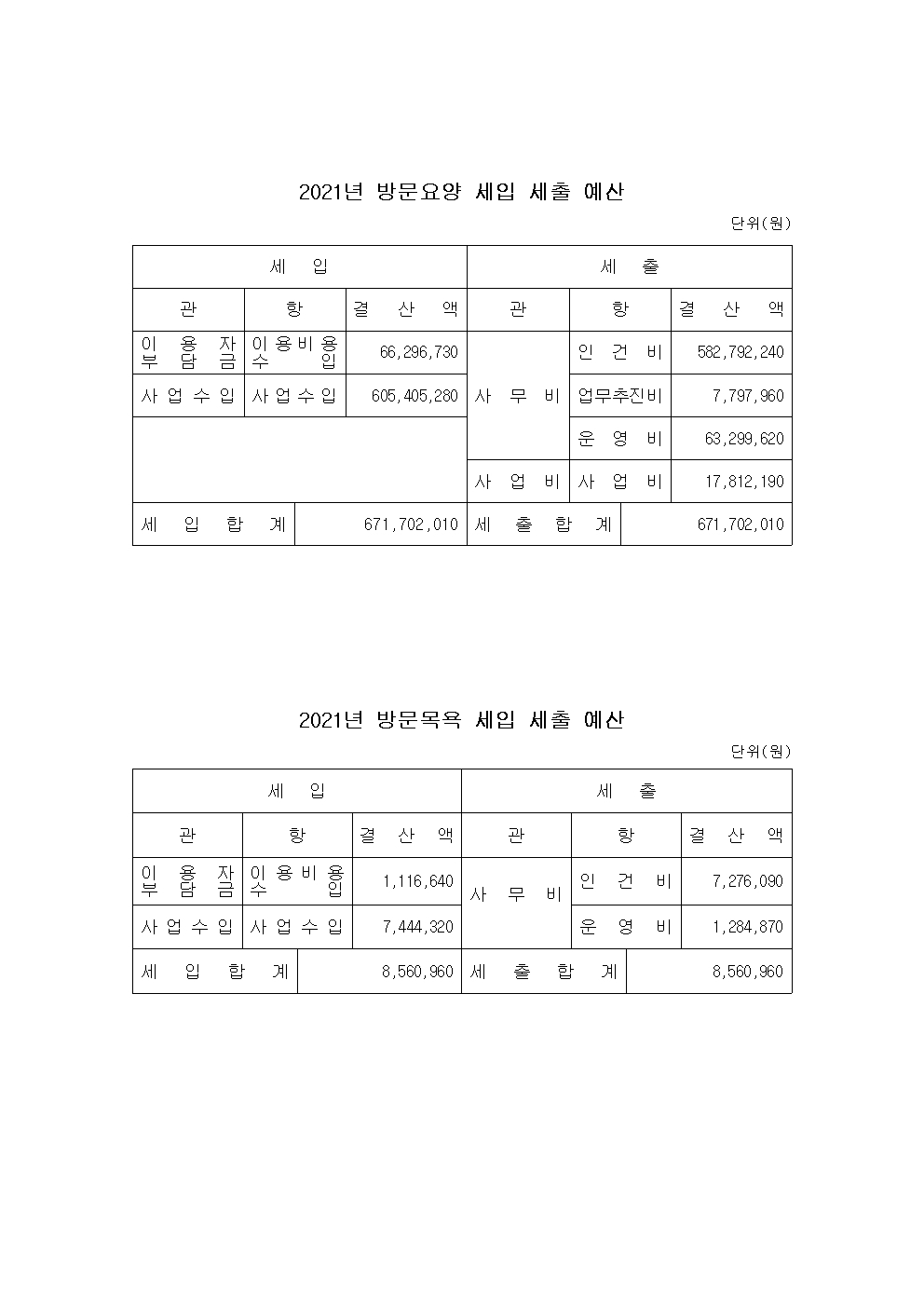 2021년 행복더하기 세입세출 예산서(방문요양/방문목욕/행복드림/장활)