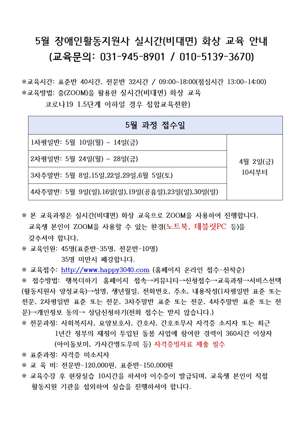 공지사항 2021년 5월 장애인활동지원사 실시간 비대면 화상 교육 접수 안내 작성자 행복더하기 등록일 21.03.29 조회수 7,675 첨부파일 2021년 5월 장애인활동지원사 실시간(비대면) 화상 교육 안내001.jpg12KB 이전글 다음글 목록