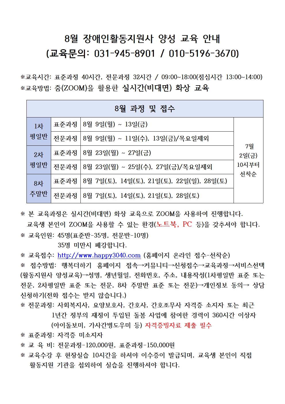 2021년 8월 장애인활동지원사 양성교육 일정 및 접수 안내