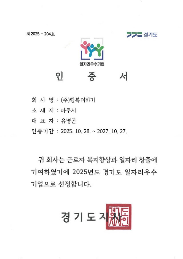 일자리우수기업인증서